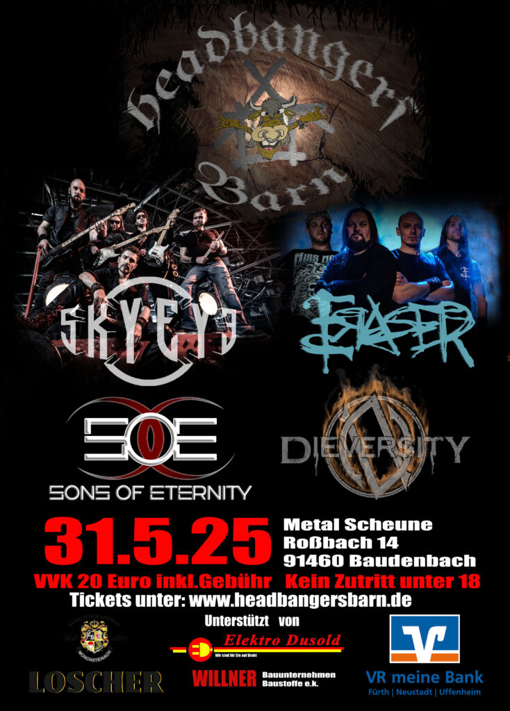 Zum dritten mal veranstalten wir nun den Headbangers Barn im Idylischen Roßbach. Unter dem Motto „Konzerte müssen bezahlbar bleiben“ haben wir eine großartige Crew aus freiwilligen Helfern, ohne die dieses Event nicht umsetzbar wäre. Ausserdem Danken wir allen die diese Veranstaltung unterstützen ! Werde auch du ein Teil der HBB Familie indem du Beiträge teilst oder einfach deinen Freunden von uns erzählst. Wir freuen uns Euch 2025 wieder mit einem tollen Lineup bei einem heimischen „Loscher Bier“ die Metal Riffs um die Ohren zu Ballern. Tickets könnt Ihr erwerben, indem Ihr uns persönlich ansprecht oder uns per e-mail an info@eraser-metal.de eine entsprechende Anfrage stellt. „Wir freuen uns auf Euer kommen“